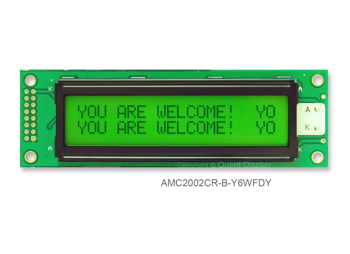 A 20×2 dot matrix Character LCD Module AMC2002CR-B-Y6WFDY display in STN Positive Yellow Green LCD Mode, Six O’clock viewing direction, Wide Temperature Range (Operating Temp: -20°C to 70°C, Storage Temp: -30°C to 80°C), and Yellow Green LED Backlight. It has a transflective polarizer, recommended for applications that will be used both indoor and outdoor. This product is assembled Chip On board with 1/16 Duty and a Controller IC ST7066Uv22 or equivalent. The interface type is Parallel. This is an ROHS Compliant product manufactured with ISO standards and procedures.
